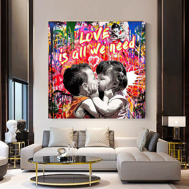 Trasforma il tuo spazio in una galleria d'arte affascinante con Banksy Amore è tutto ciò di cui abbiamo bisogno Graffiti Tela Arte da Parete, dove ogni pezzo racconta la propria storia unica e ogni dettaglio intricato aggiunge profondità e fascino al tuo ambiente.
