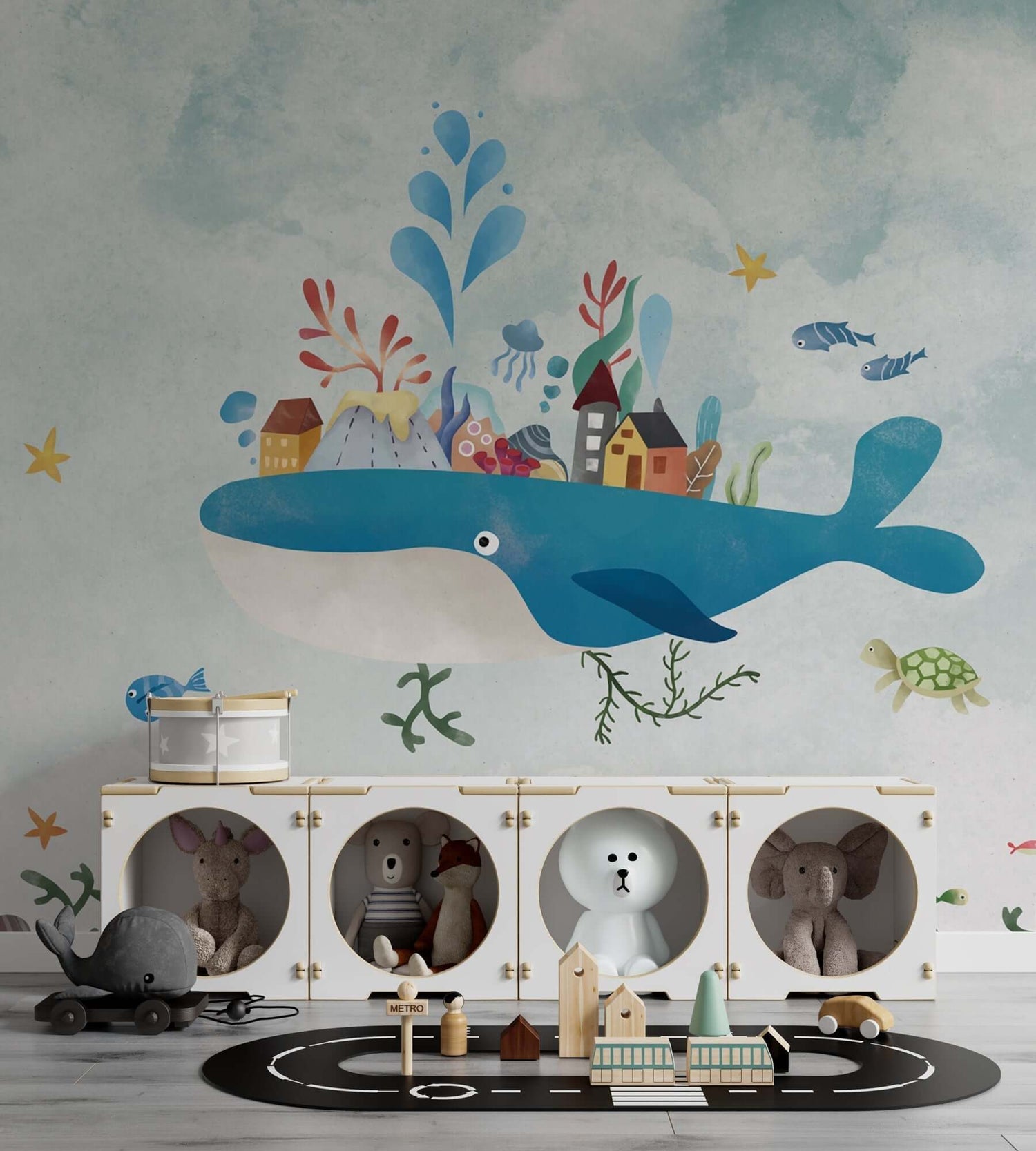 Upgrade your space with Whale Adventure - Kids Room Wallpaper Mural, a premium wallpaper mural designed for living rooms, bedrooms, nurseries,offices, hallways, and commercial interiors. Our custom wallpaper murals are made to order, ensuring a seamless fitand a professional wall finish.
